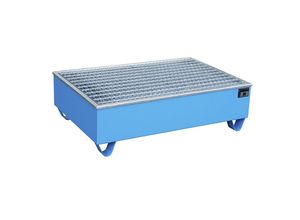Stahl-Auffangwanne mit PE-Einsatz, für 200-l-Fässer, LxBxH 1215 x 815 x 365 mm, blau lackiert. Anlieferung = montiert. Ausführung Gitterrost = mit…
