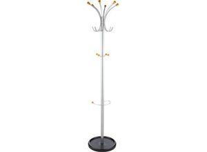 Garderobenständer, Ø 365 x H 1760 mm, 6 Hut-/Mantelhaken & 4 Haken für Schals & Taschen, mit Schirmhalter & Tropfmulde, Stahl, silbermetallic