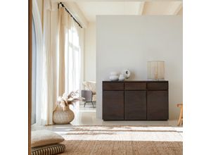 Das Buffet wengé FSC® 150 Eva von Tikamoon im trendigen eleganten Stil ist aus gebürstetem Mahagoni! Viel Stauraum durch 3 Schubladen und 3 grosse Fächer…
