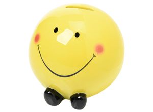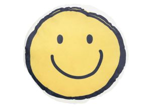 Weiches Kissen in Weiß und Gelb in Form eines lächelnden Emojis. Aus weichem Material inklusive Füllung.