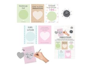 · Kraftpapier · bestehend aus 5 Karten mit Sprüchen, 3 runde und 2 herzförmige Sticker