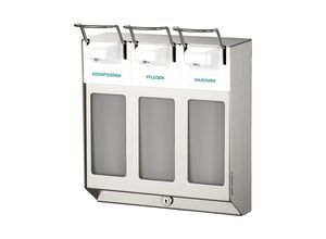 Reihenspender, mit 3 Spendern à 1000 ml, Edelstahl. Anlieferung = montiert. Inhalt = 3 Liter. Gehäusefarbe = Edelstahl. Höhe = 321 mm. Breite = 272 mm.…