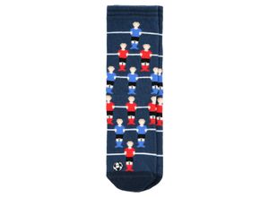 Ein Paar dunkelblaue Socken mit Fußball-Motiven in allover. Elastische Rippbündchen für einen bequemen Sitz. Deshalb ist dieses Produkt nachhaltig:…
