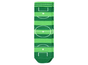 Ein Paar grün-hellgrün gestreifte Socken im Stil eines Fußballfeldes. Elastische Rippbündchen für einen bequemen Sitz. Deshalb ist dieses Produkt…