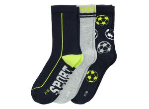 Drei Paar Socken mit zertifizierter Bio-Baumwolle in Nachtblau und Hellgrau. Mit verschiedenen Sport- und Fußball-Motiven und neongrünen Akzenten. Deshalb…