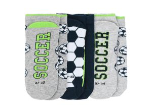 Drei Paar Sneaker-Socken in Hellgrau meliert und Dunkelblau mit verschiedenen Fußball-Motiven und neongrünen Akzenten. Jeweils mit elastischen Bündchen.…