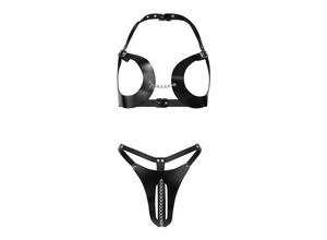 Ein verführerischer Bikini, der mit seinem heißen Ouvert-Look alle Blicke auf sich zieht. Das fesselnde Dessous-Ensemble ist aus schwarzem Echtleder…