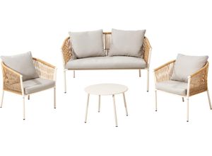 · Gestell: Stahl mattbeige pulverbeschichtet · Geflecht: PE-Rattan naturfarben · Sitz-und Rückenkissen: Stoff hellgrau · TKZ gemäß Herstellerangabe ·…