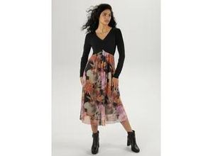 Der ideal Begleiter für den Herbst! Das Kleid von Aniston Selected mit uni schwarzem Jerseyoberteil und gefüttertem Meshrock mit Blumendruck. V-Ausschnitt…